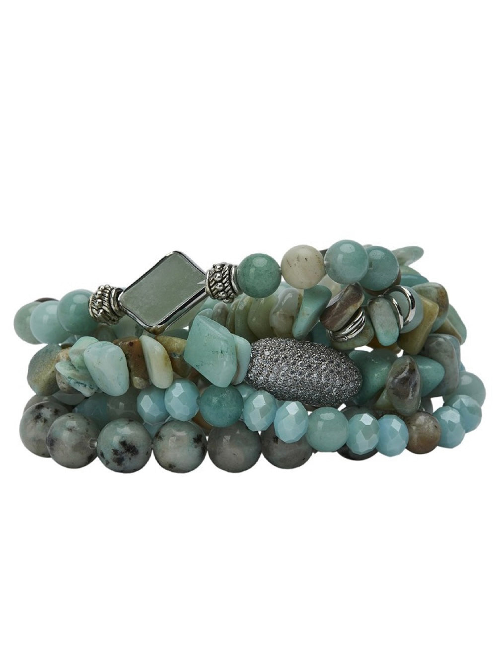 Dekoratives Armband aus 5 Bändchen mit unterschiedlichen Ziersteinen und Glasperlen. Sie changieren von grün bis aquablau. Mit Gummizug gearbeitet.