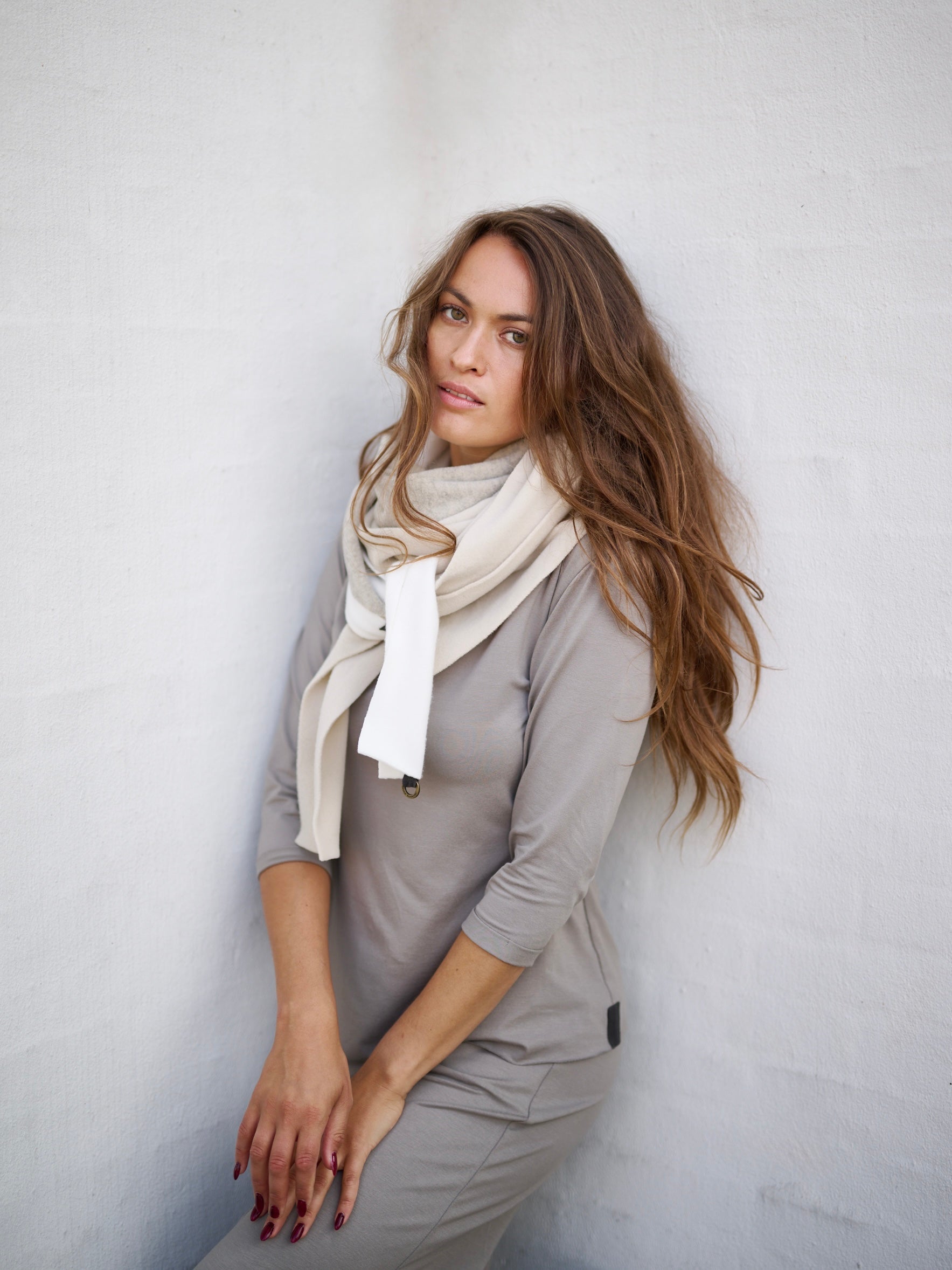 Fleece Schal NO WASTE als Dreieckstuch mit kleinen Textildetails aus Ripsband. Der super softe Fleecestoff lässt jeden kalten und windigen Tag alt aussehen. Der Schal ist auf Reisen ein perfekter Begleiter als Kissen oder Schmusedecke. Die Farben des Schals passen perfekt zu den angebotenen Pullovern von Henriette Steffensen.