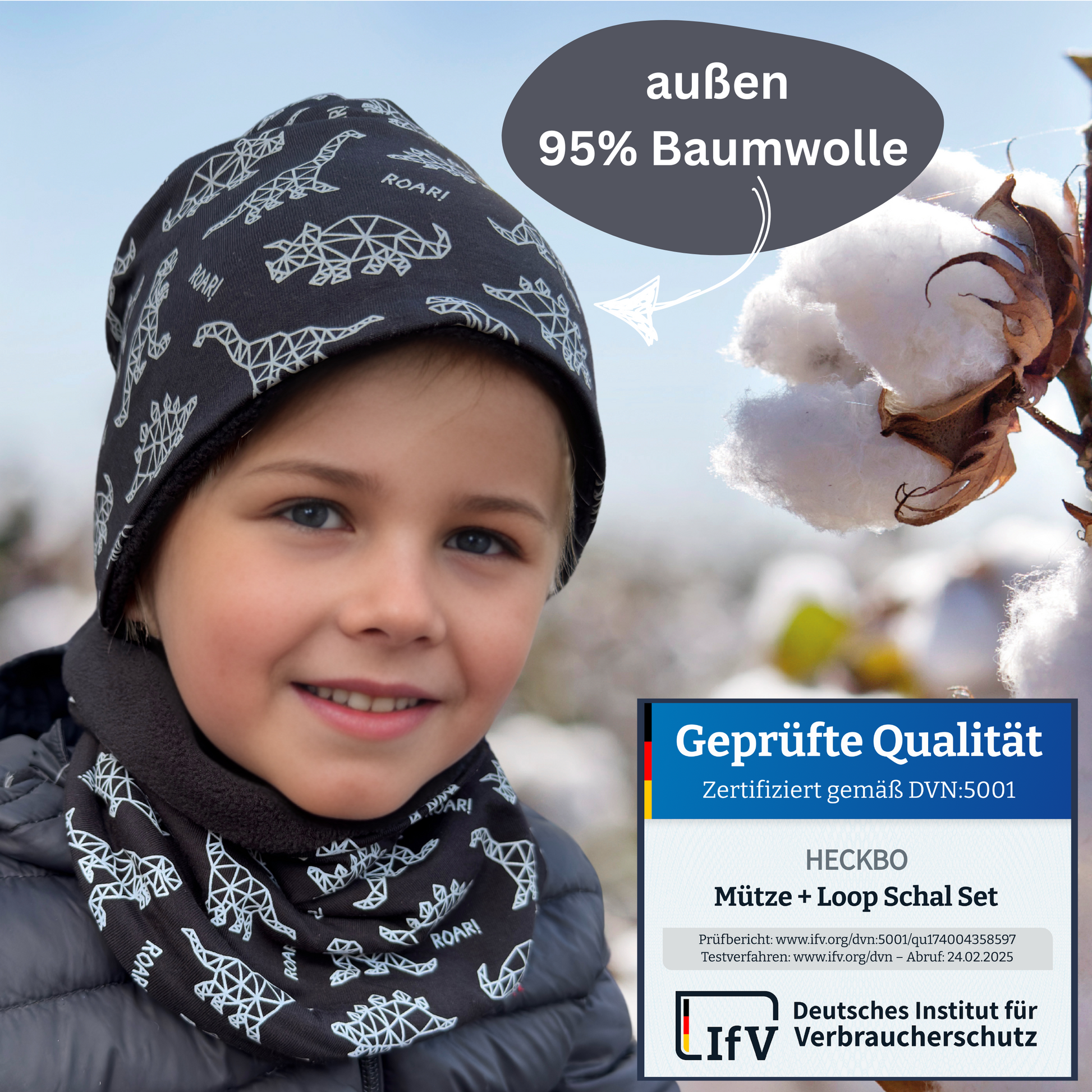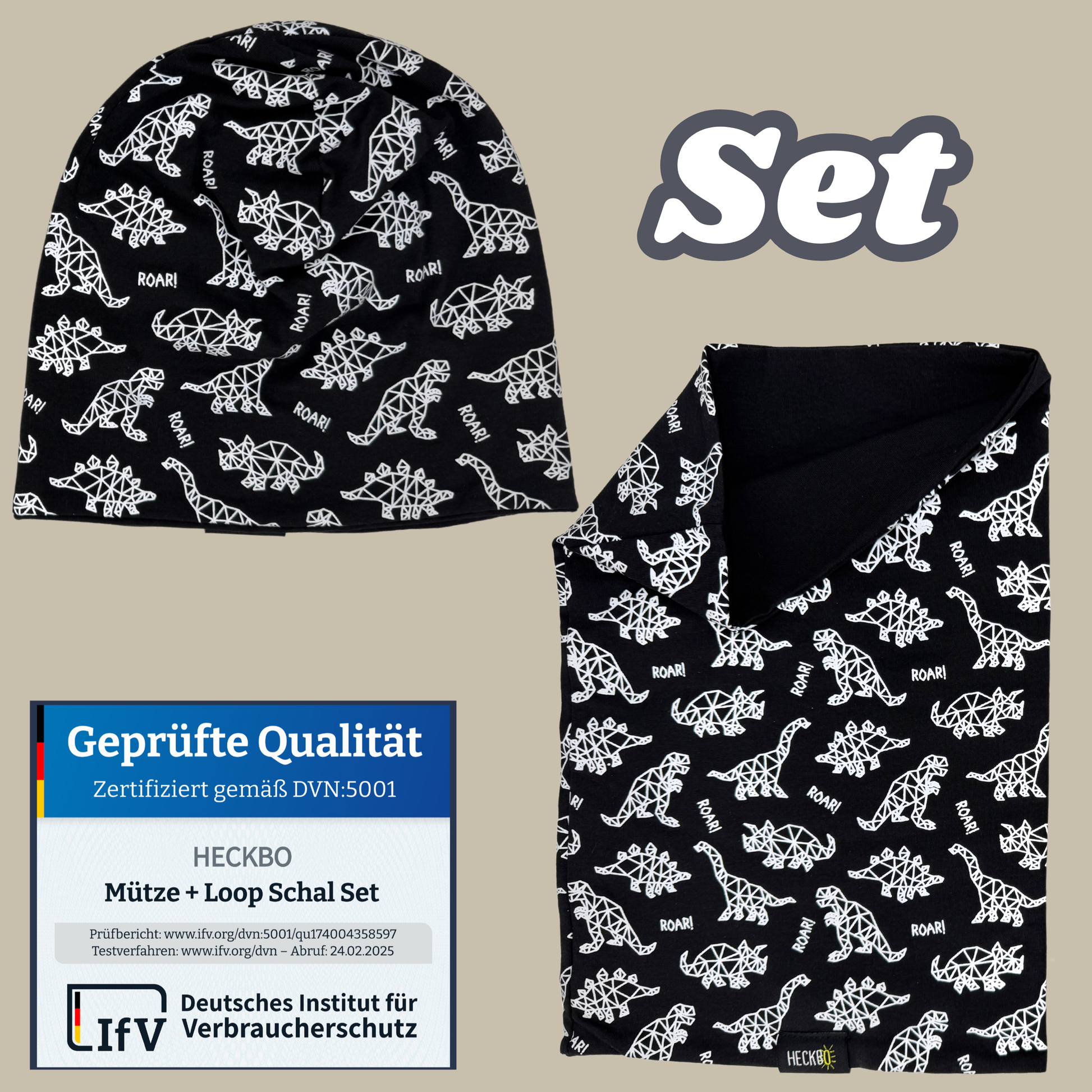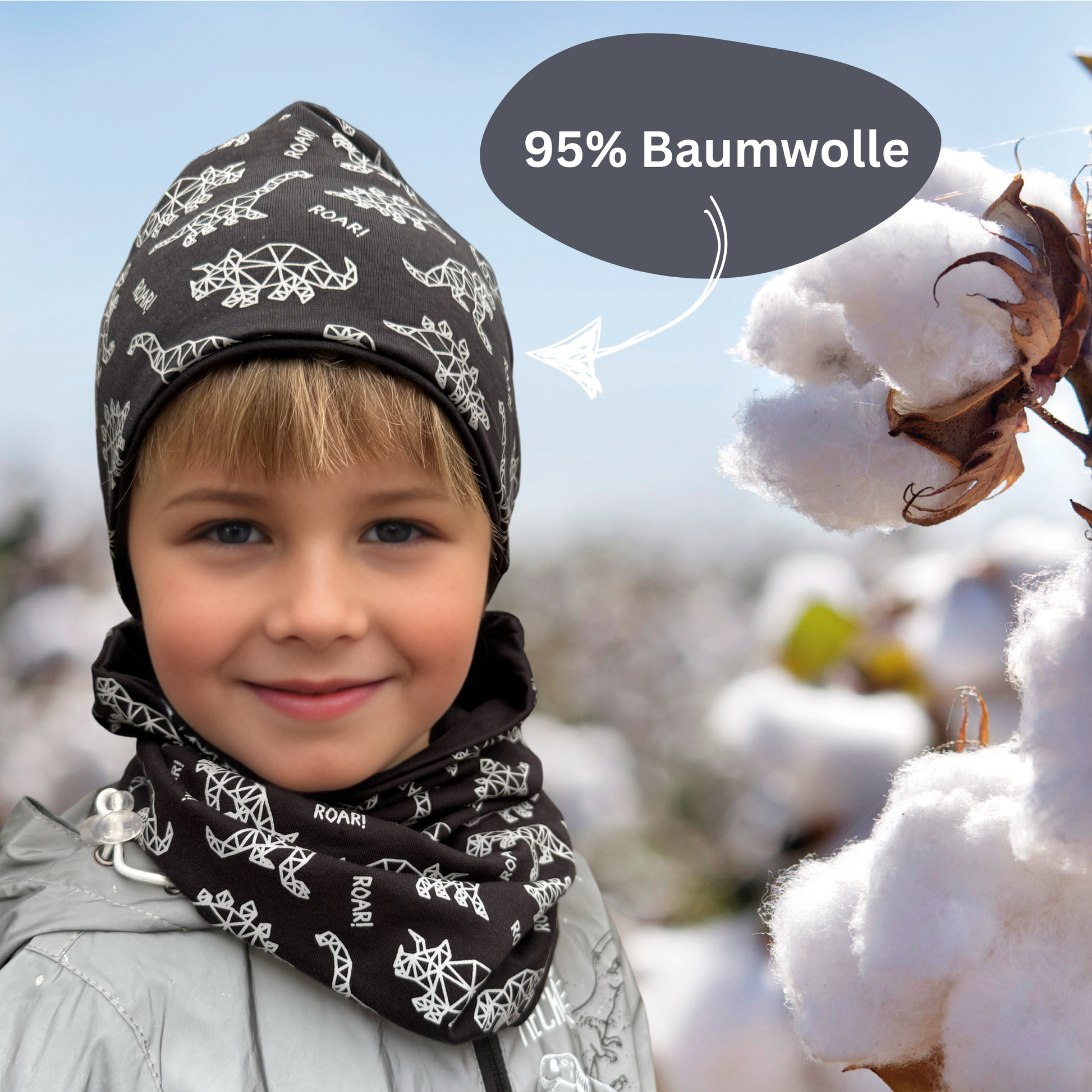 Sicherer Sitz ohne Rutschen, atmungsaktiv und hochwertig verarbeitet: Dieses Set bietet alles, was kleine Dino-Fans im Winter brauchen.
