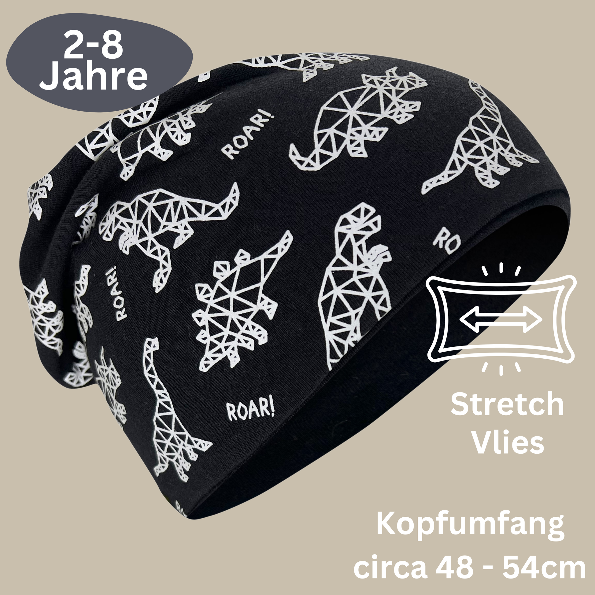 One Size – ideal für einen Kopfumfang von ca. 48–54 cm. Das elastische Material (95 % Baumwolle, 5 % Elasthan) wächst mit und sitzt bequem – ohne zu verrutschen.