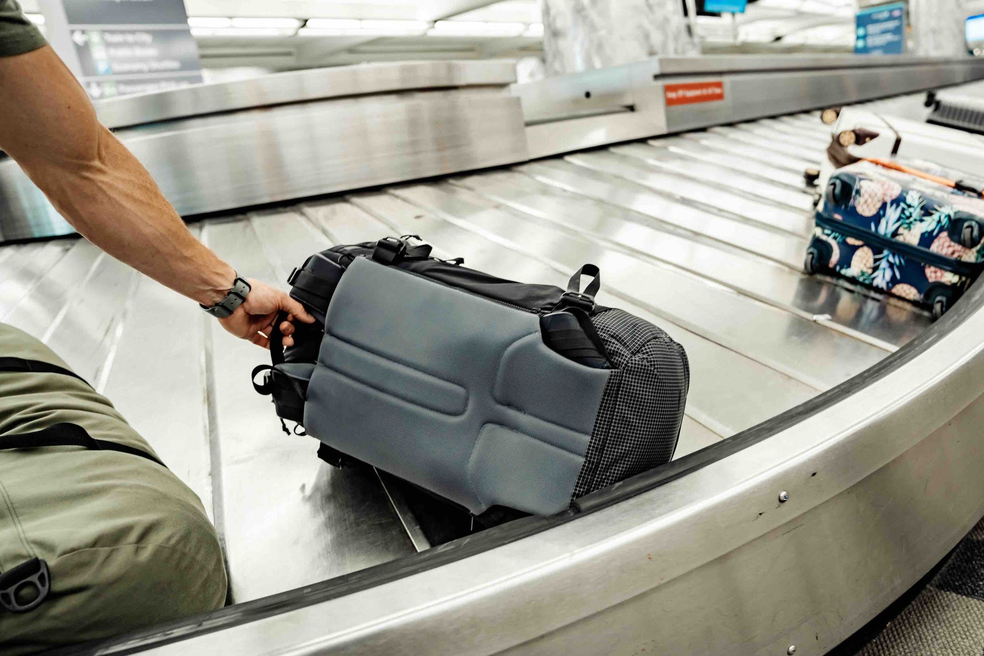Reißverschluss an der Rückseite, um die Schultergurte und den Hüftgurt zu verstauen, wenn Sie die Tasche aufgeben.